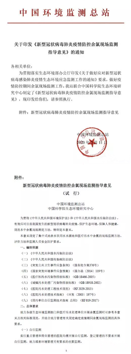 中國(guó)環(huán)境監(jiān)測(cè)總站發(fā)布《新型冠狀病毒肺炎疫情防控余氯現(xiàn)場(chǎng)監(jiān)測(cè)指導(dǎo)意見(jiàn)》